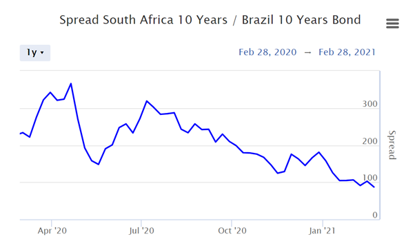 South African bonds have dominated the Le Roux International portfolios following the pandemic’s substantial global risk-off response. where South African bonds and the Rand were sold indiscriminately in favour of the USD, presenting significant capital appreciation opportunities along with bond yields above 10%. The investment thesis was that South African bonds yields would narrow to its emerging market peers, providing the potential for an excellent return at low risk. To illustrate below is the spread between South Africa and Brazil’s bond yields for the last year.