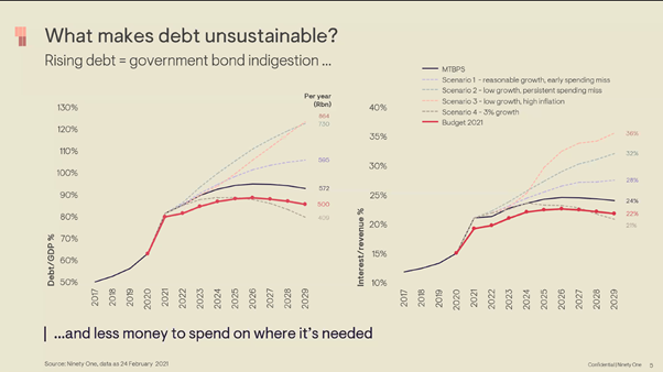 With solid returns in the bank, a question got stuck in my mind. With the divergence in global economic recoveries as wealthy nations acquired the COVID vaccines and at the same time, our bumbling state reneged on their governance responsibilities. Where is the line where South Africa is no longer able to sustain its debt levels? When do we move, and what are the investment alternatives?